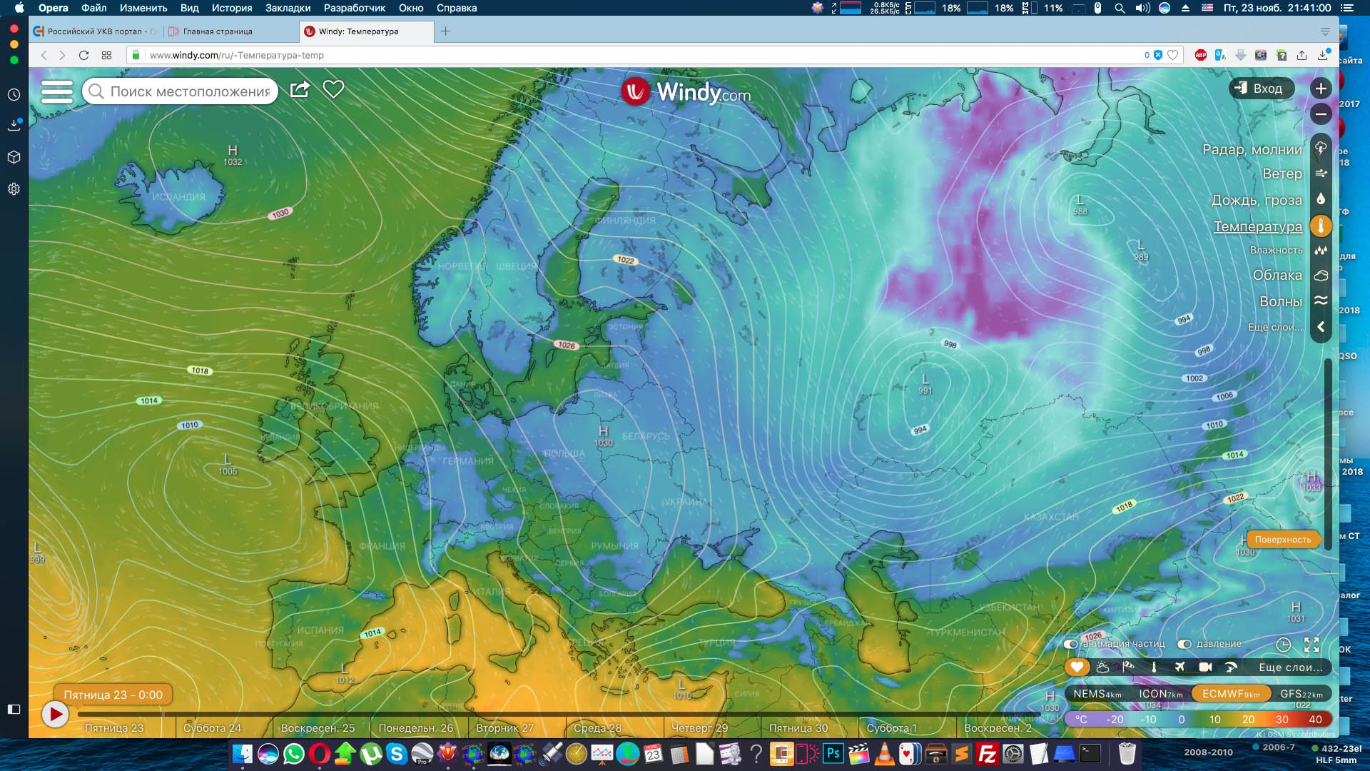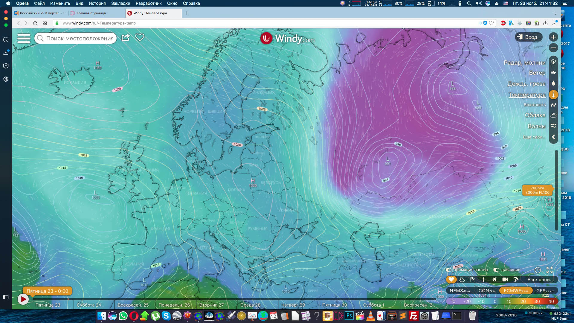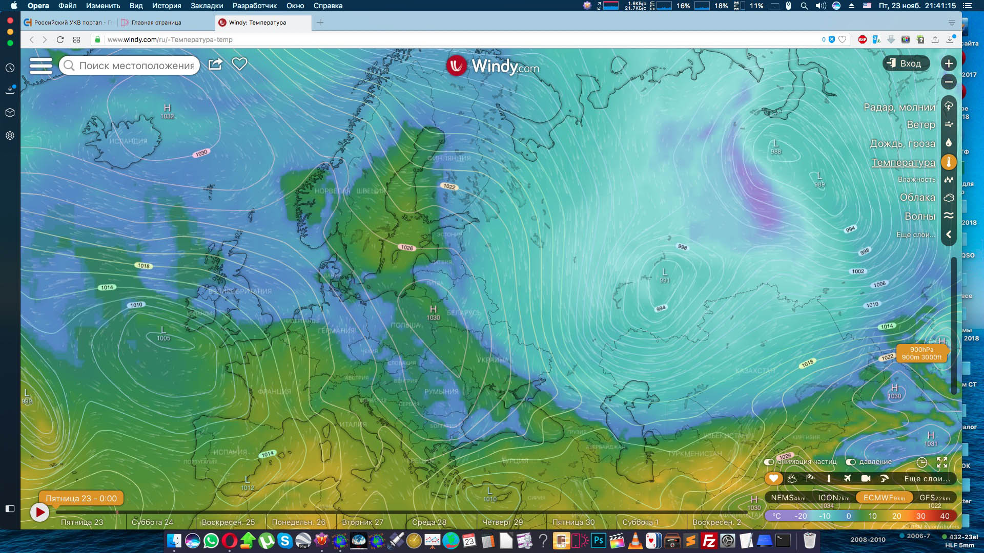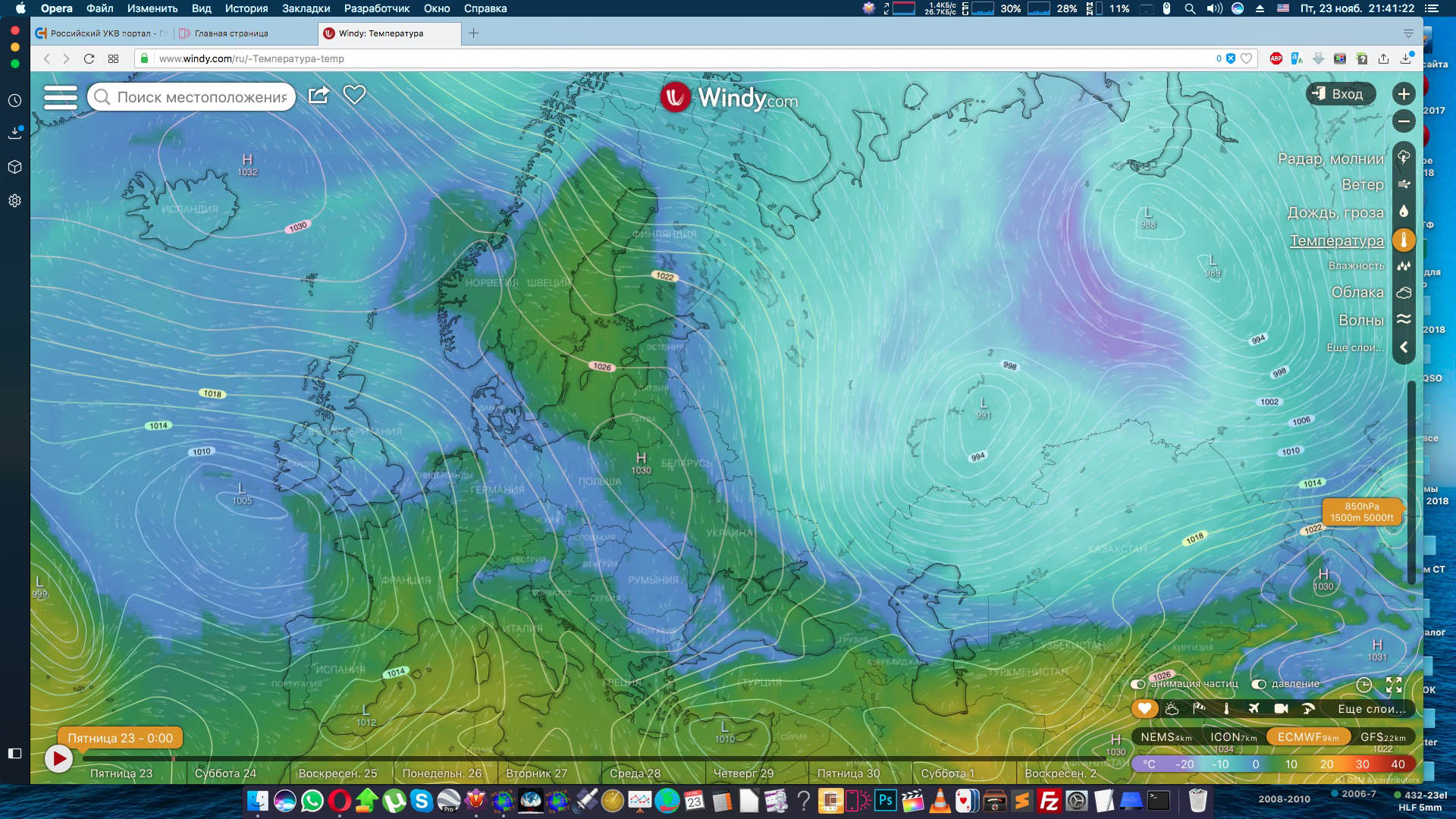 Карты температуры воздуха на разных высотах - вечер 22 ноября 2018 г: