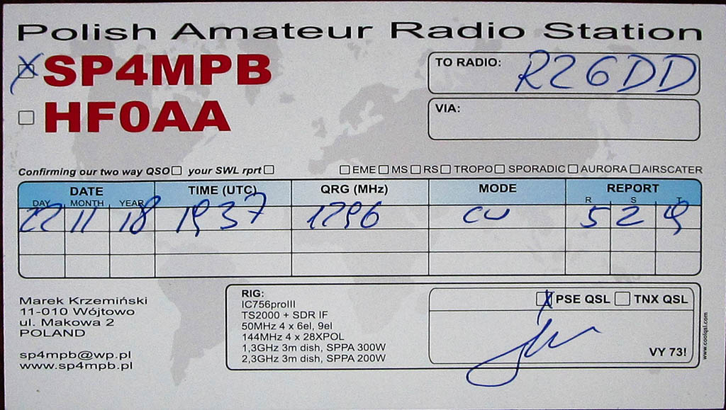 Только включился на частоту 1296.200 мгц - сразу услышал SP4MPB - Marek. На таком расстоянии станций в этом диапазоне никогда раньше не слышал. До этого личным рекордом было 1251 км, связь TROPO с RN3DKQ.