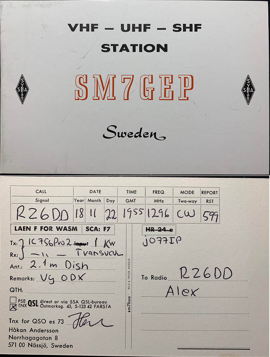 Через 18 минут - новый ODX, новая страна и новый рекорд России на диапазоне 23 см: SM7GEP (JO77ip) - 2283 км! Предыдущий рекорд дальности 1296 мгц держался 10 лет и 2 недели (1916 км).